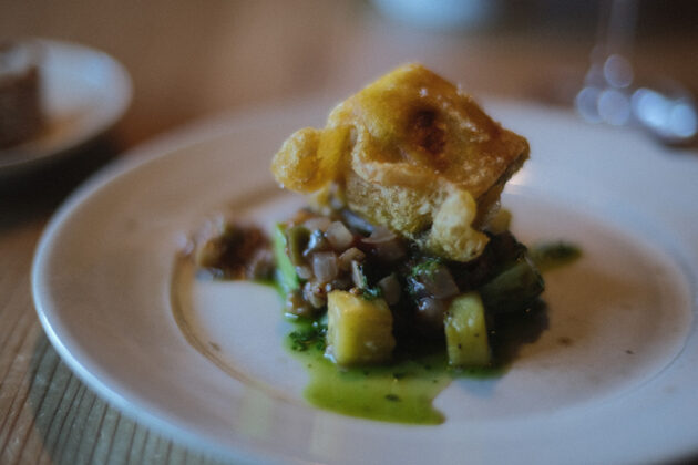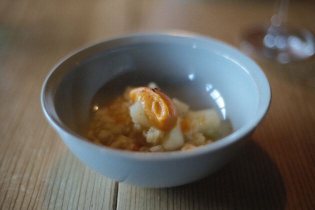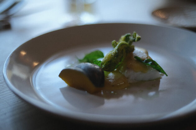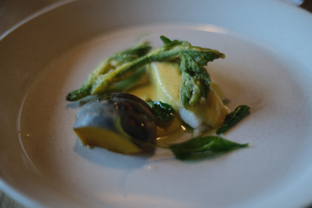 甘味が強いかぼちゃに、かぼちゃの茎の部分のフリットと石鯛が添えられた一品。