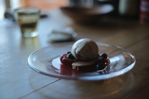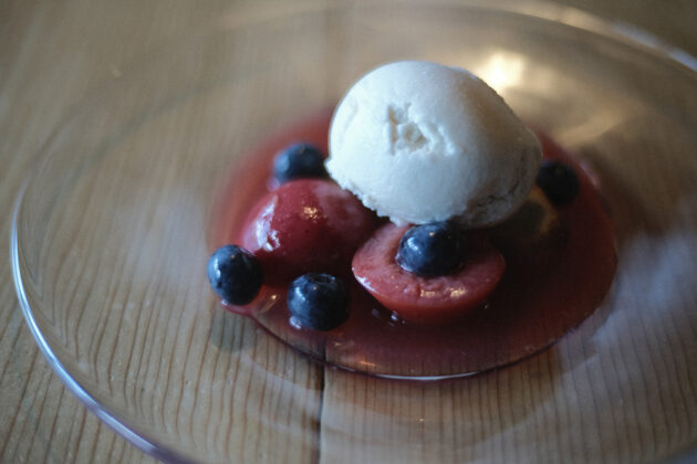 最後のデザートは、プラムのコンポートとブルーベリー、オリジナルのリンゴケーキの上にアイスクリームが乗った一品。